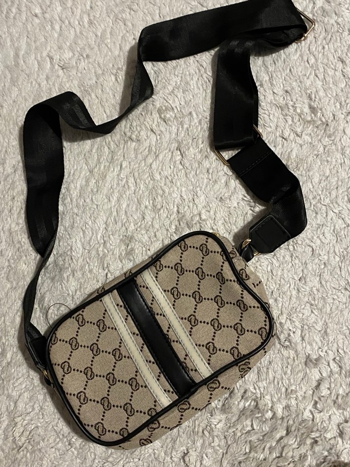 Kahverengi baskılı, tokalı kadın omuz çantası, gri tonlu sentetik kumaştan, trend sokak stili için uygun.