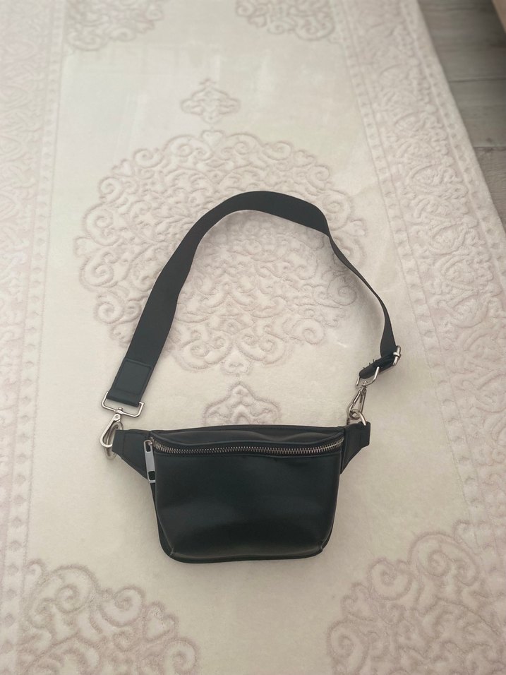Siyah, bel detaylı minimalist kadın bel çantası. Trendy casual sokak stili için uygun, desensiz sade tasarım. 1 veya 2 kez kullanıldı. Kusuru yok.