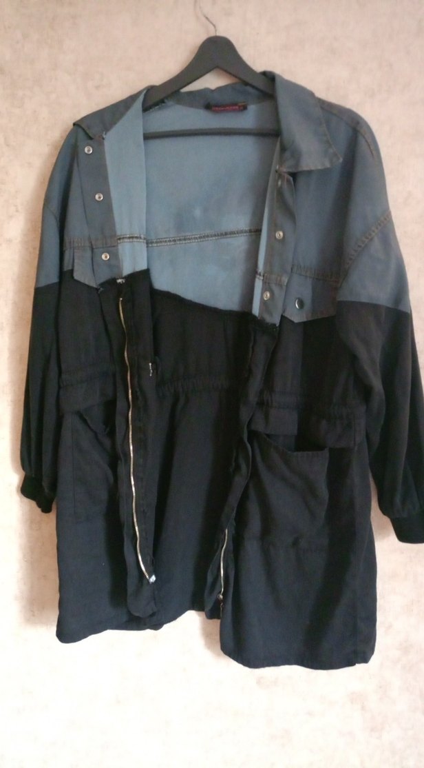 Bu koyu mavi kot ceket, bol kesim ve kesik yaka detayına sahiptir. Uzun kollu, belden kemerli ve midi boyda, sokak modasına uygundur.