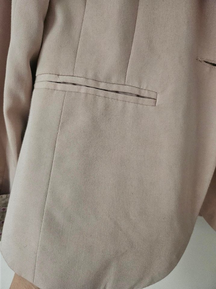 Pudra renkte, düğmeli, uzun kollu, kol çiçek detaylı, belden oturmalı benzer