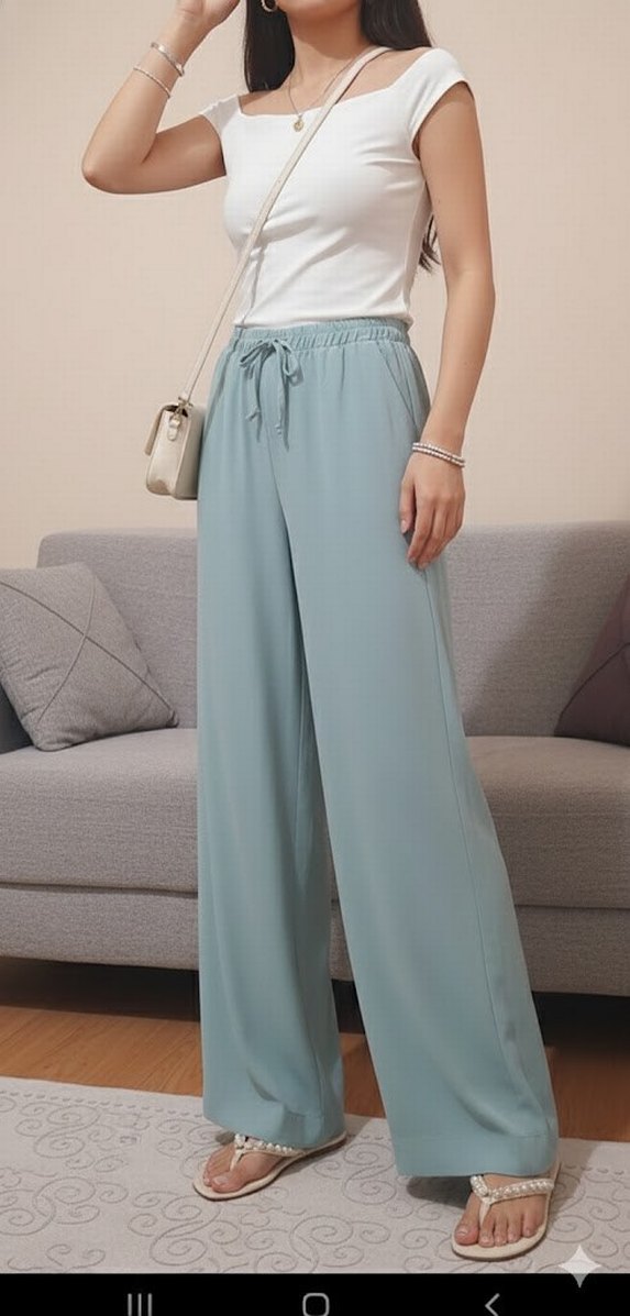 Beli lastikli ve bağcıklı, pastel tonlarda geniş paça kumaş pantolon, rahat ve şık günlük kullanım için uygundur.