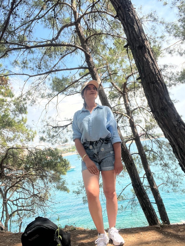 Kadınlar için açık mavi batik desenli, kemerli beli olan bol kesim mini denim Bermuda şort. Rahat ve sokak stiline uygun.bir kere giydim dar geldi kalçadan sıktı