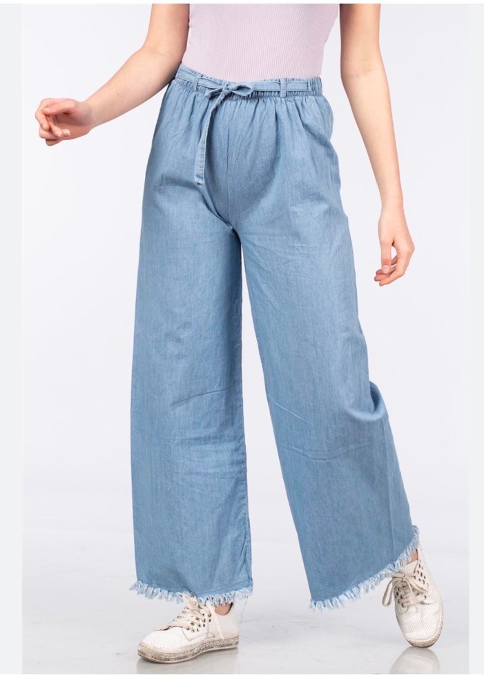 Kadınlar için beli kemerli, bol kesim, pastel mavi renkte denim pantolon. Normal midi boyda ve püsküllü paçalarla günlük rahat kullanıma uygun. Kullanılmıştır. Paçası püsküllü cepli beli lastikli ve bağlama detaylıdır. Ölçülerini ekledim ona göre de değerlendirebilirsiniz.