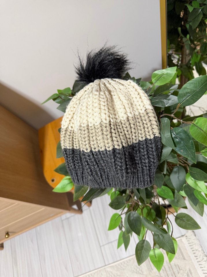 Gri tonlarında örgü kumaştan yapılmış, bohem tarzda kadın bere. Üstünde yumuşak ponpon detayı bulunur.
