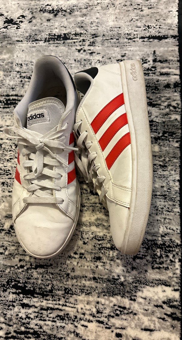 Kırmızı çizgili, bağcıklı beyaz Adidas kadın spor ayakkabısı. Kauçuk malzemeden, ince topuklu, günlük kullanım için uygundur.