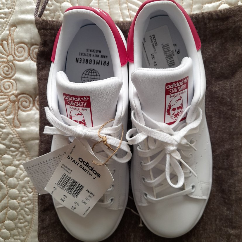 Beyaz Adidas Stan Smith kadın spor ayakkabısı, pastel detaylı, bağcıklı, düz tabanlı ve baskılı, sokak stili ve spor için uygundur. hediye geldi sifir urundur