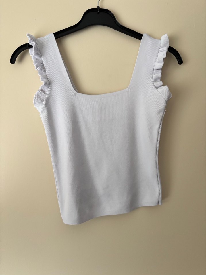Beyaz, kolsuz, fırfırlı askılı, vücuda oturan atlet. Yumuşak sentetik kumaştan, minimalist ve günlük sokak tarzına uygun.