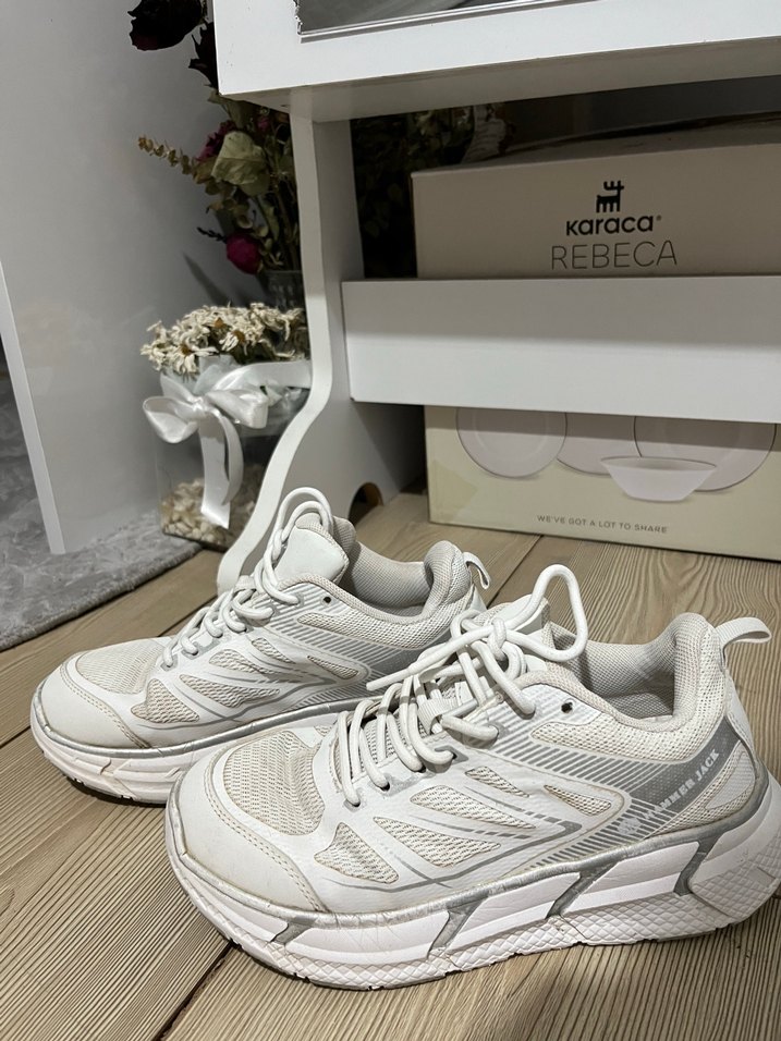 Beyaz kadın spor ayakkabısı, rahatlık için kauçuk tabanlı ve stilettolu görünümlü. Düz, sade ve zahmetsiz şıklık sunar. Marka: Karaca Rebeca.