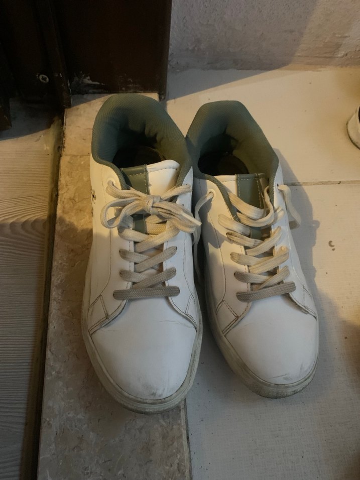 Kadınlar için beyaz, bağcıklı ve ince topuklu sneakers. Minimalist tasarıma sahip, kauçuk tabanlı rahat ayakkabı.
