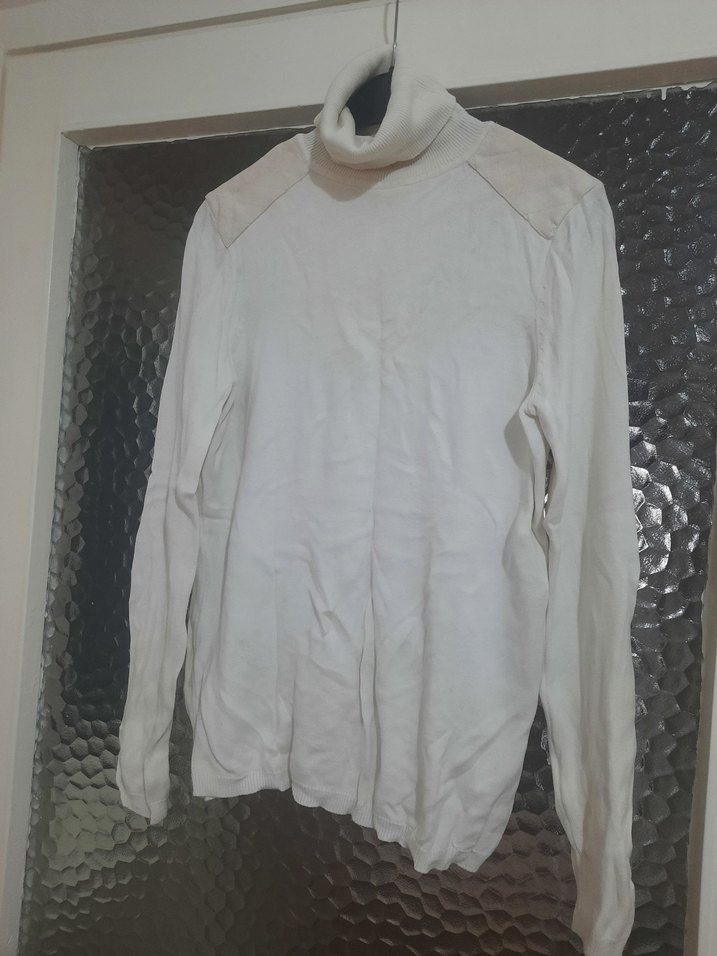 Bu beyaz kadın balıkçı yaka triko, uzun kollu ve vücuda oturan kesime sahiptir. Yumuşak kumaştan yapılmıştır, minimalist tasarımı dış mekan kullanımı için uygundur.