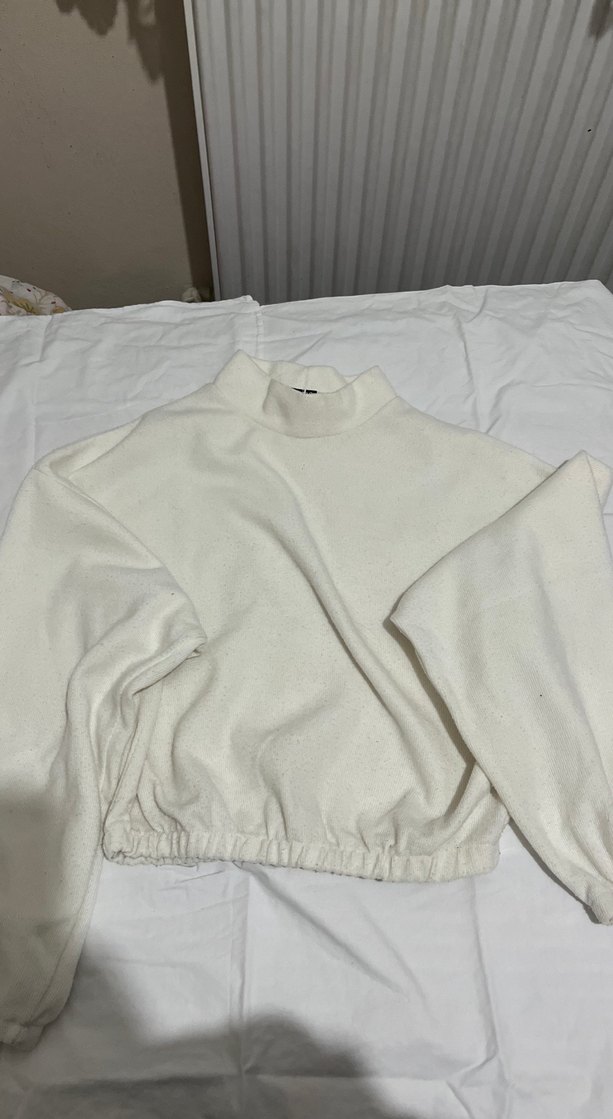 Kadınlar için yüksek yakalı ve uzun kollu, yumuşak keten kumaştan rahat bir sweatshirt. Bol kesim ve büzgülü etek ucu ile günlük kullanıma uygun pastel beyaz rahat bir model.