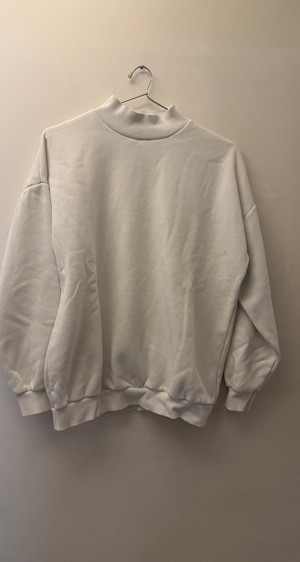 Kadınlar için bisiklet yaka, uzun kollu ve bol kesim beyaz basic sweatshirt. Yumuşak keten kumaştan, minimalist sokak tarzında, günlük kullanım için uygun.