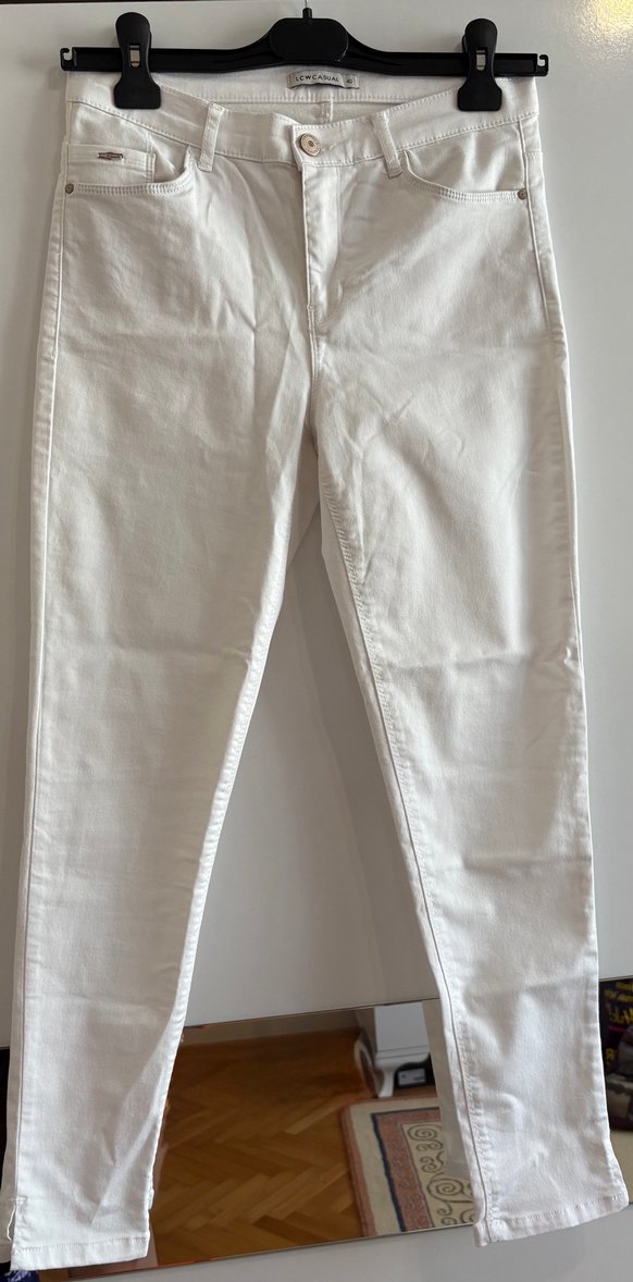 Kadınlar için pamuk kumaştan yapılmış beyaz skinny pantolon, normal boy ve regular fit. Desensiz, günlük kullanıma uygun rahat ve şık bir stildir.