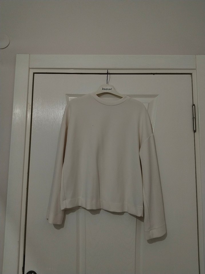 Beyaz renk, yuvarlak yaka ve uzun kollu, rahat kesim kadın sweatshirt. Günlük kullanım için yumuşak dokulu, minimalist ve desensiz tasarım.
