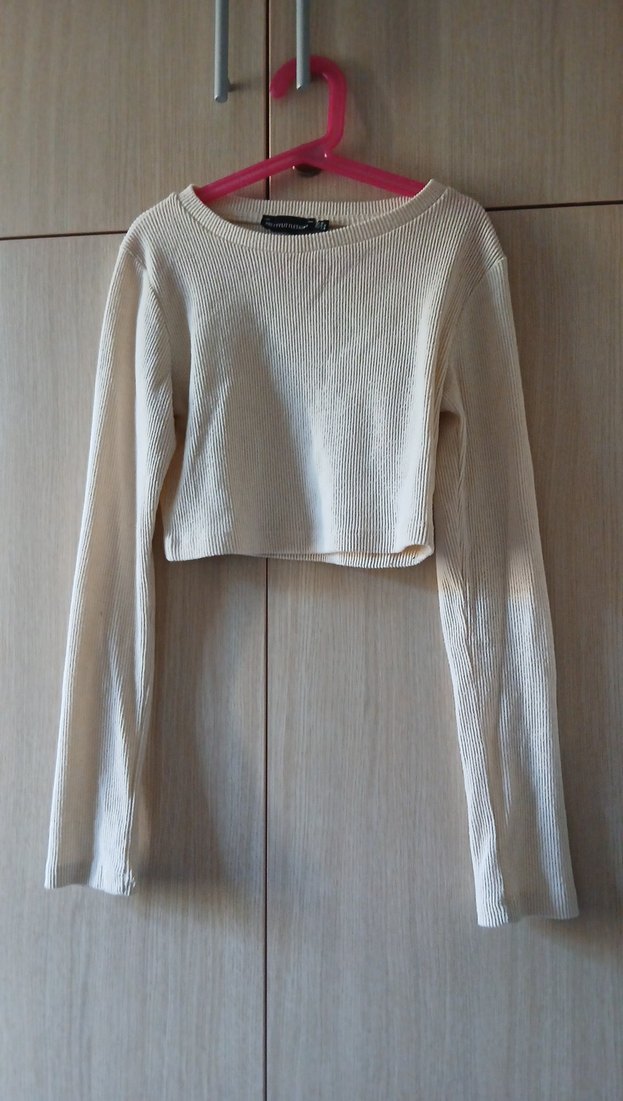 Kadınlar için uzun kollu, bisiklet yaka, keten kumaştan örme triko. Bol kesim, pastel beyaz renkte, gündelik kullanıma uygun.