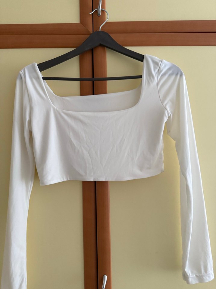 Beyaz, uzun kollu, tek renk pamuklu kumaştan yapılmış, tekne yakalı ve vücuda oturan kadın bluz. Günlük kullanıma uygun sade tasarım.