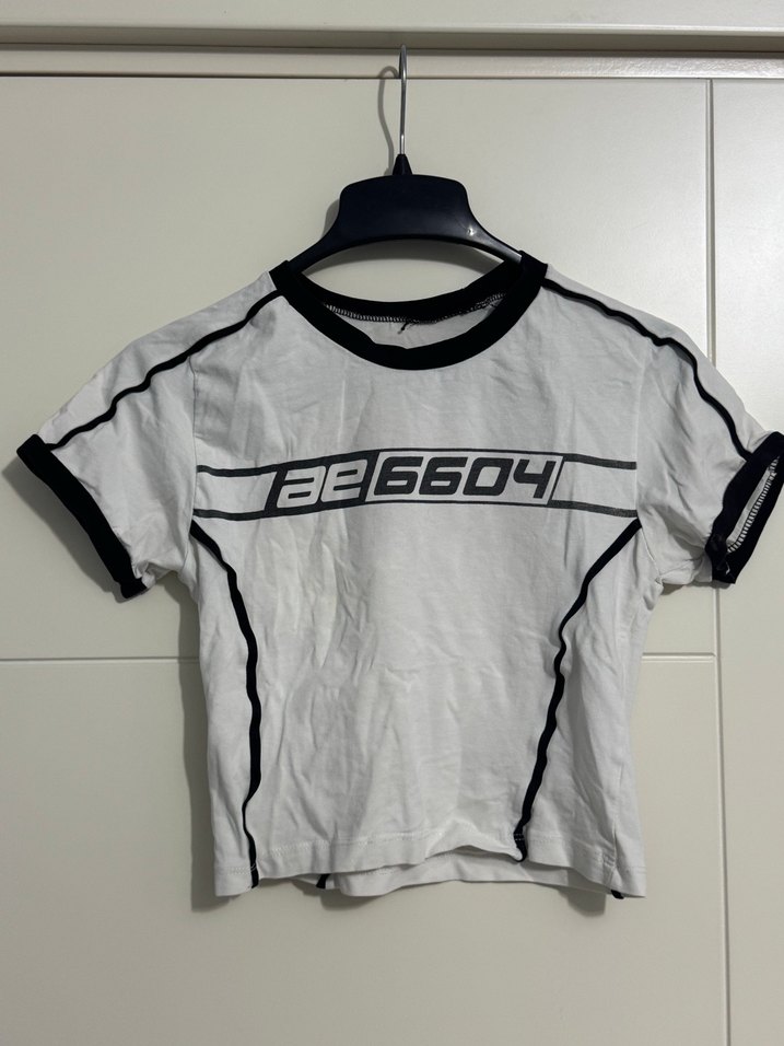 Pamuk kumaştan, kısa kollu ve bisiklet yaka, beyaz baskılı ve siyah detaylı, kısa kesim, kadın crop tişört. Trendy ve sportif bir görünüm sunar.