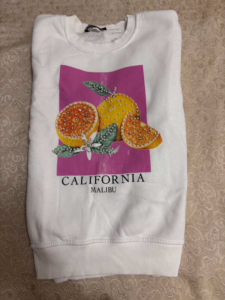 Kadınlar için pamuklu, kısa kollu ve yuvarlak yakalı, bol ve kısa kesim beyaz sweatshirt. Üzerinde turuncu desenli ve payetli baskı yer alır.