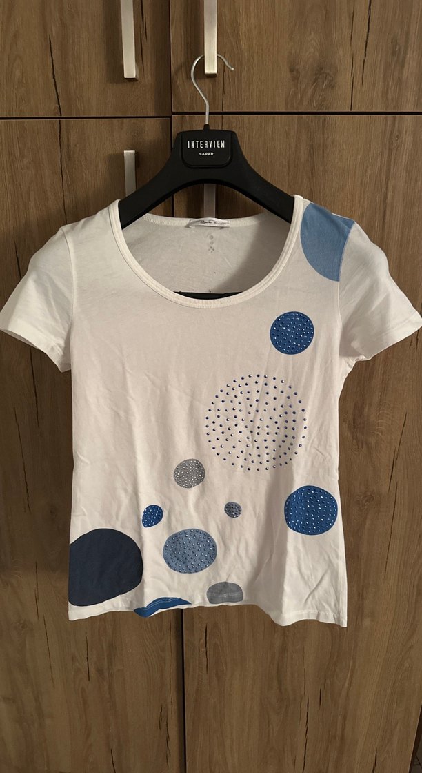 Kadın beyaz tişört, kısa kollu ve yuvarlak yakalıdır. Pamuklu kumaştan üretilmiş, baskılı mavi ve gri daire desenleri ve düğme detayları bulunur. İtalyan hiç giyilmedi