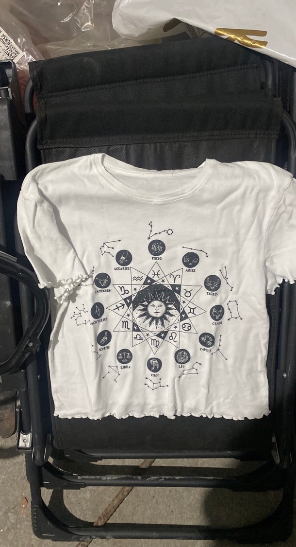Pamuklu, beyaz ve baskılı burç desenli, kısa kollu, yuvarlak yaka, bol kesim kadın tişörtü. Rahat ve günlük kullanım için uygun.