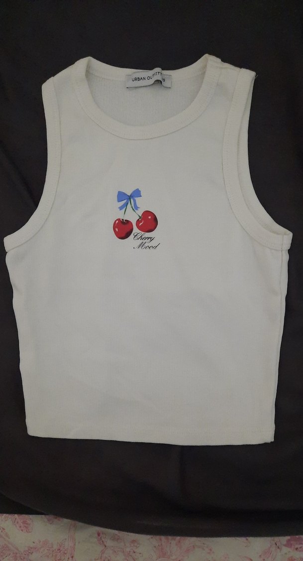 Beyaz renkli, pamuklu ve kolsuz kız çocuk atletinde mavi kurdeleli kiraz baskısı bulunur. Rahat ve şık, günlük sokak stiline uygundur.