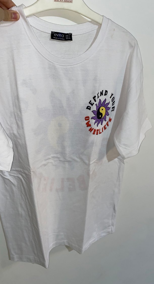 Erkekler için beyaz pamuk tişört, bol kesim, yuvarlak yaka ve kısa kollu. Üzerinde 'DEFEND YOUR OWN BELIEFS' yazılı baskı ve yin-yang sembolü bulunur. Sokak stili ve bohem tarzını yansıtır.
