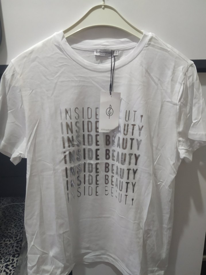Beyaz pamuklu tişört, yuvarlak yaka ve kısa kollu, bol kesimdir. Gri renkte 'INSIDE BEAUTY' yazılı baskıya sahiptir. Günlük kullanıma uygun, rahat ve şık bir modeldir.