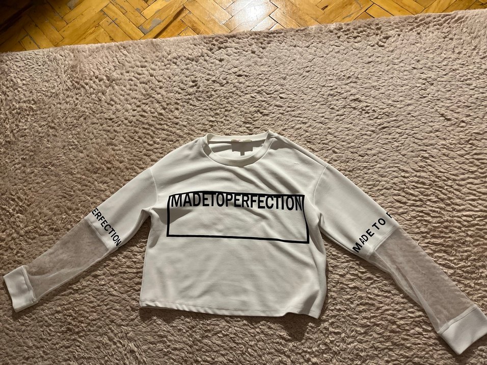 Beyaz pamuklu, uzun kollu ve bol kesim tişörtü göğüs ve kollarda "MADETOPERFECTION" baskısıyla rahat ve şık athleisure tarzı sunar.