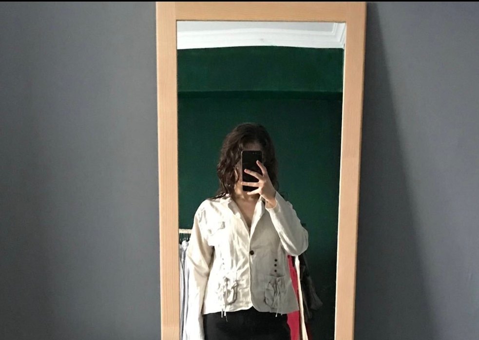 Beyaz keten blazer, uzun kollu ve keskin yaka detaylıdır. Batik desenli, düğmeli ve günlük kullanıma uygundur.