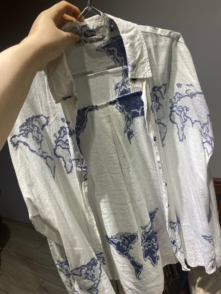 Batik dünya haritası desenli beyaz keten gömlek, kısa kollu, yakalı ve düğmeli, bol kesim sokak stili gömlek.