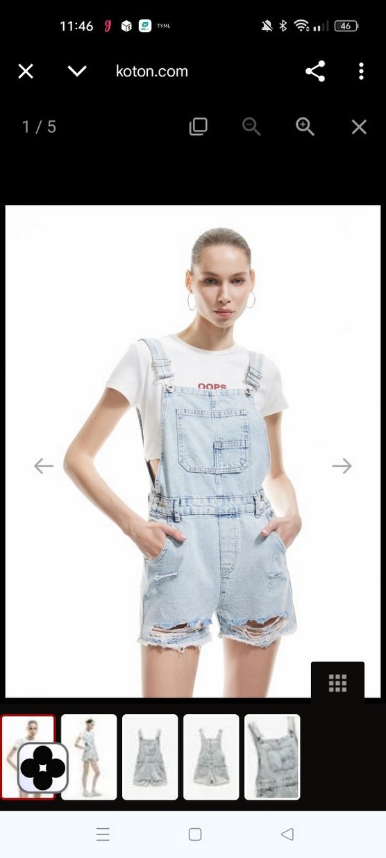Beyaz, pastel batik desenli, straplez yaka ve bol kesim kısa denim salopet. Rahat ve şık sokak stili için ideal. ✨