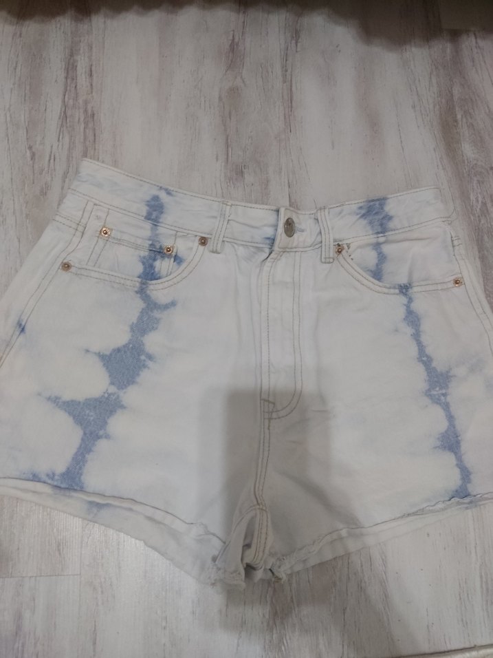Beyaz pastel batik desenli, düğmeli, bol kesim kadın kot mini şort. Günlük kullanıma uygun rahat sokak stili.