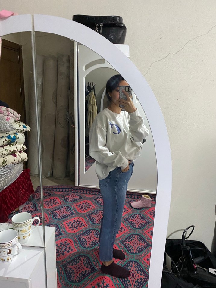 Beyaz renkli, batik desenli, bol kesim midi boy denim pantolon. Rahat ve şık sokak stili için uygundur.