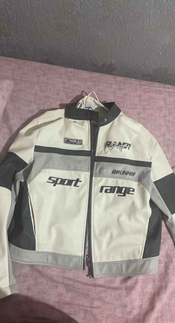 Uzun kollu, fermuarlı, baskılı detaylara sahip beyaz biker deri ceket. Düz kesim ve yuvarlak yaka ile sportif tarz sunar. ️