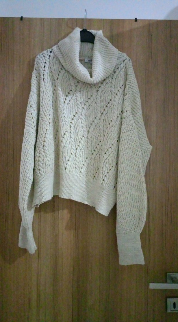 Kadın beyaz boğazlı, örgü kazak, bol kesim ve uzun kolludur. Yumuşak örme kumaştan yapılmış, normal midi boyda, günlük rahat kullanıma uygundur.