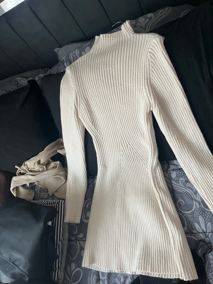 Beyaz boğazlı, uzun kollu, vücuda oturan kadın triko elbise. Yumuşak sentetik kumaştan yapılmış, uzun ve desensiz, günlük kullanım için uygundur.