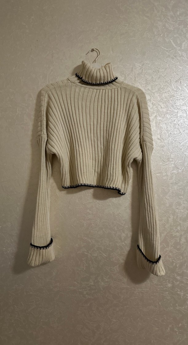 Dar kesim, boğazlı ve uzun kollu kadın triko kazak. Normal midi boyda ve ince koyu detaylarla günlük kullanıma uygun.