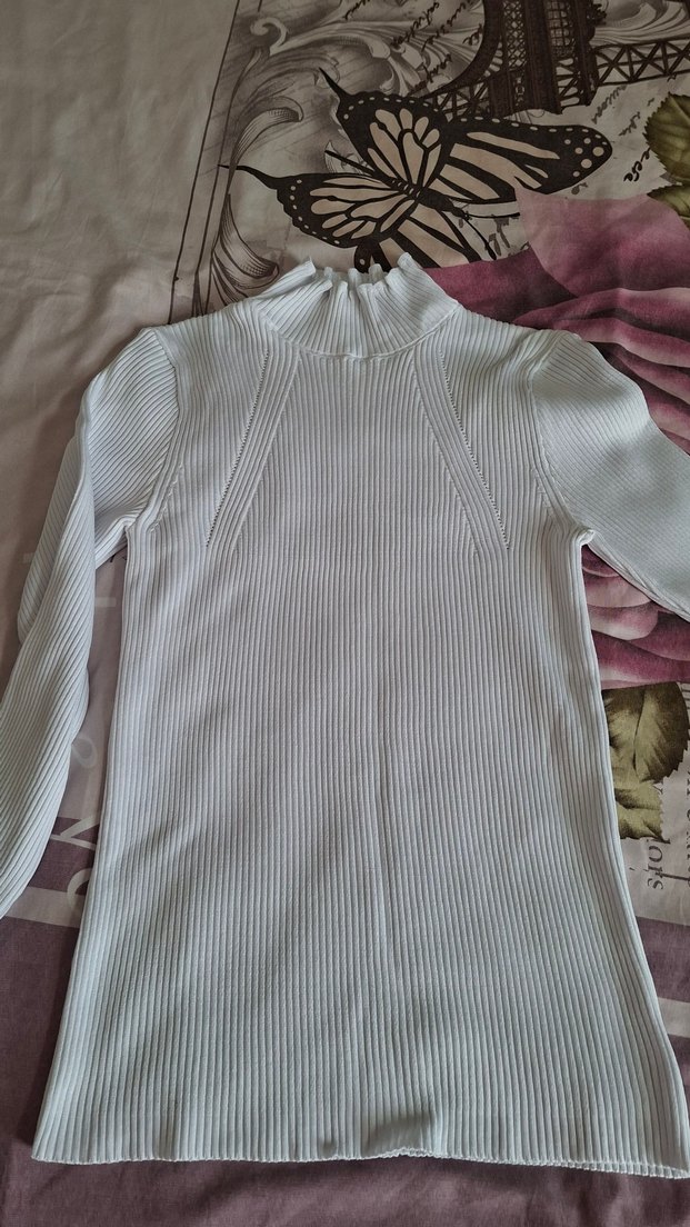 Beyaz, boğazlı ve uzun kollu, vücuda oturan ama çok esnek triko kazak. Yumuşak örme midi boyda ve desensiz, günlük sokak stiline uygun. çok rahat bana dar kaldi biraz kullanamadim