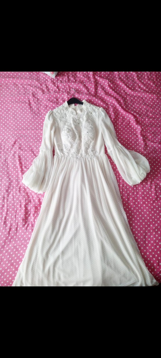 Bu beyaz bohem uzun elbise dantel detaylar ve işlemeler içerir. Yumuşak pamuktan üretilmiş, uzun kollu ve yüksek yakalı, bol kesimdir ve düğünler için uygundur.