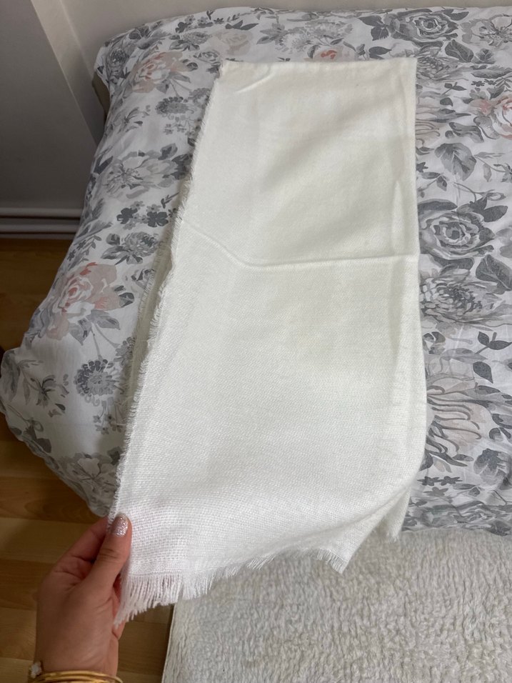 Yumuşak sentetik kumaştan yapılmış, beyaz ve gri tonlarında sade, drape tasarımlı kadın şalı. Rahat ve bohem tarzda bir aksesuar. Ürün birkaç kez kullanılmıştır.