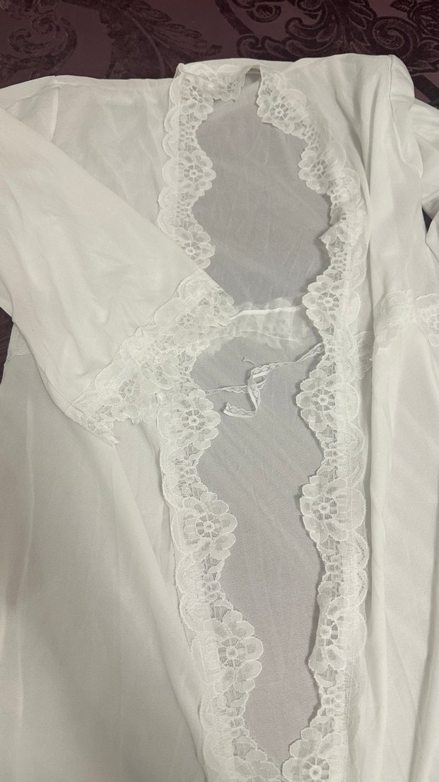 Fitted kesim, askılı kollu beyaz kadın sabahlık, ön kısmında dantel detaylarıyla bohem Paris tarzı sunar. Midi boyda. Dört parça ürün yeni hiç giyilmedi çeyizden kaldı yatagin altındaydı
