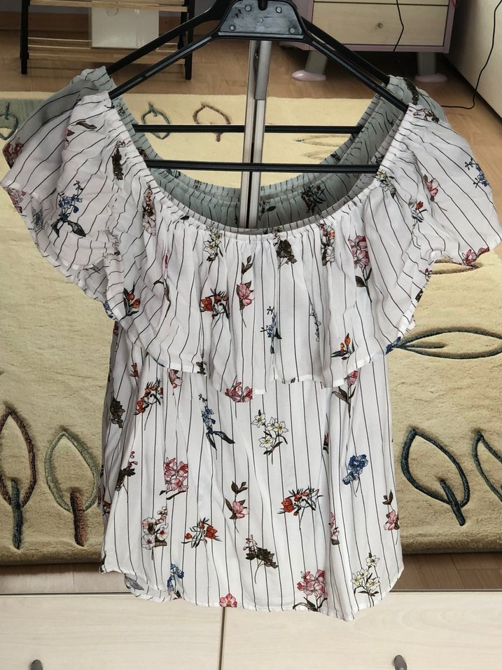 Beyaz straplez mini bluz, kısa kollu ve fırfır detaylıdır. İnce çizgili ve çiçek desenli, bol kesim bohem tarzda bir üründür.