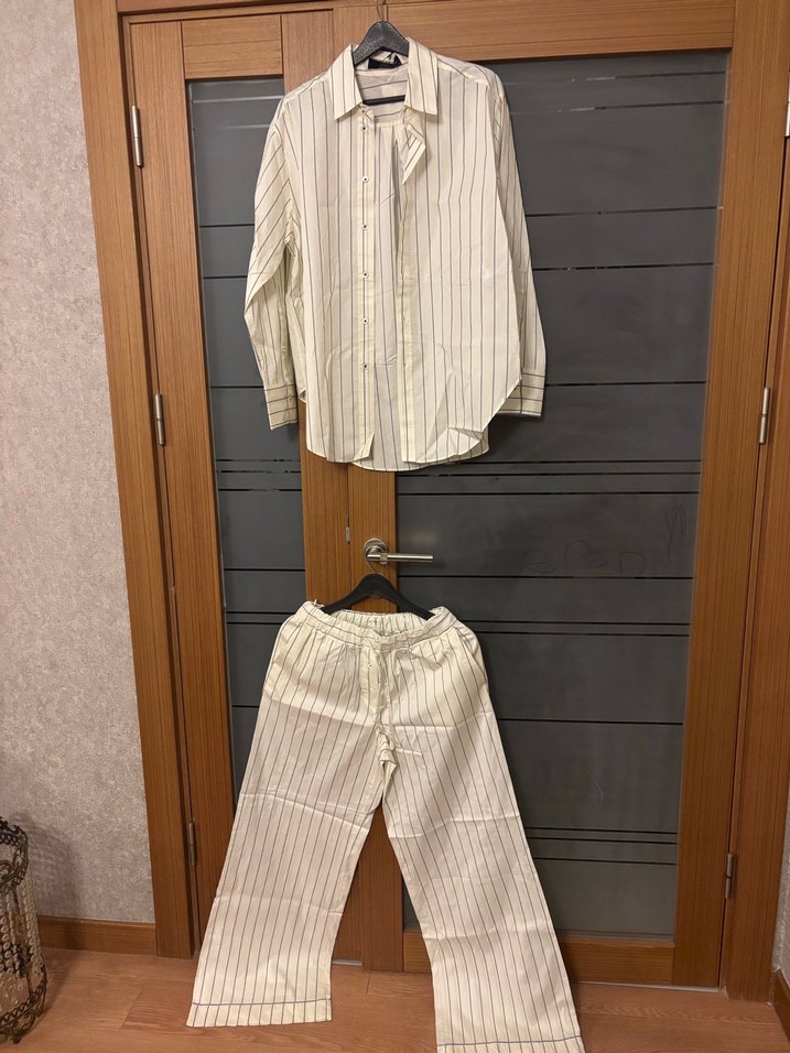Kadın gömlek pantolon takımı, düğmeli ve yakası kesik uzun kollu gömlek ile regular fit. İnce çizgili beyaz kumaştan, rahat midi boy pantolonlu. Pantolon boy 105 bel 35 cm ama lastikli. Pijama gibi tasarım yapmışlar. Gömlek göğüs 56 boy 72 cm. İpek karışımlı pamuklu kumaştan. Gömlekte Kol ağızları ve arkası pantolonda paça kısmında biyeli geçişli şık takım