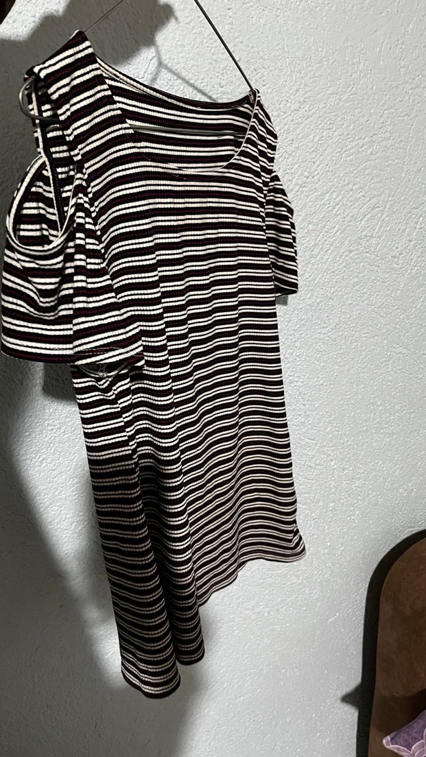 Kısa kollu, tekne yaka ve pile detaylı hamile midi elbise. Rahat kesimli, koyu çizgili ve günlük sokak tarzına uygun.