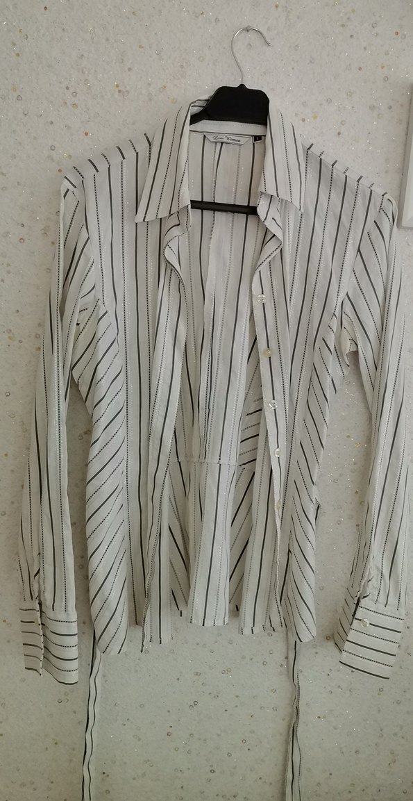 Kadınlar için uzun kollu, keten kumaştan, beyaz ve gri çizgili, pileli detaylı regular fit gömlek. Notch yaka ve midi boyda, ofis için uygun şık tasarım. Gümüş sim çizgileri var. Esnek kumaştır. Az kullanıldı. Hatası yoktur