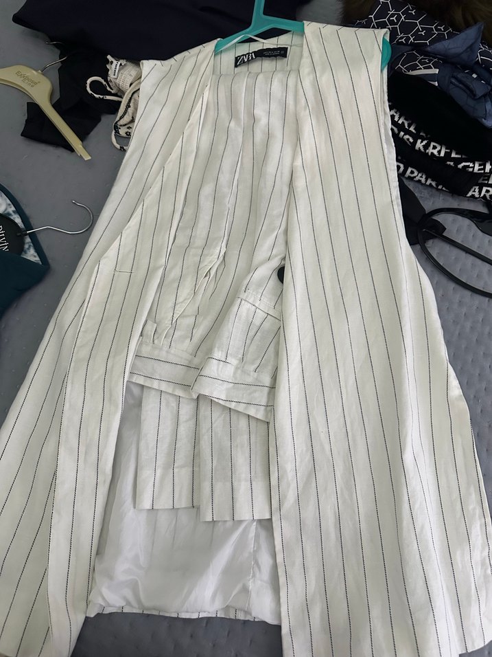 Kadınlar için uzun beyaz keten yelek, pileli ve kesimli yaka detaylı, kolsuz ve gri çizgili, ofis şıklığı için Paris sokak modasına uygun.