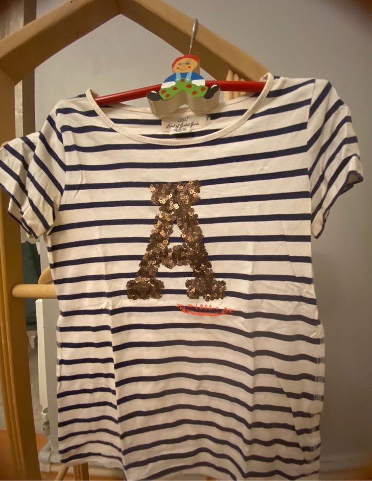 Kadın beyaz tişört, kısa kollu ve yuvarlak yaka. Lacivert çizgiler ve önünde payetli 'A' harfi bulunur. Velcro detaylı, rahat ve günlük kullanıma uygun.