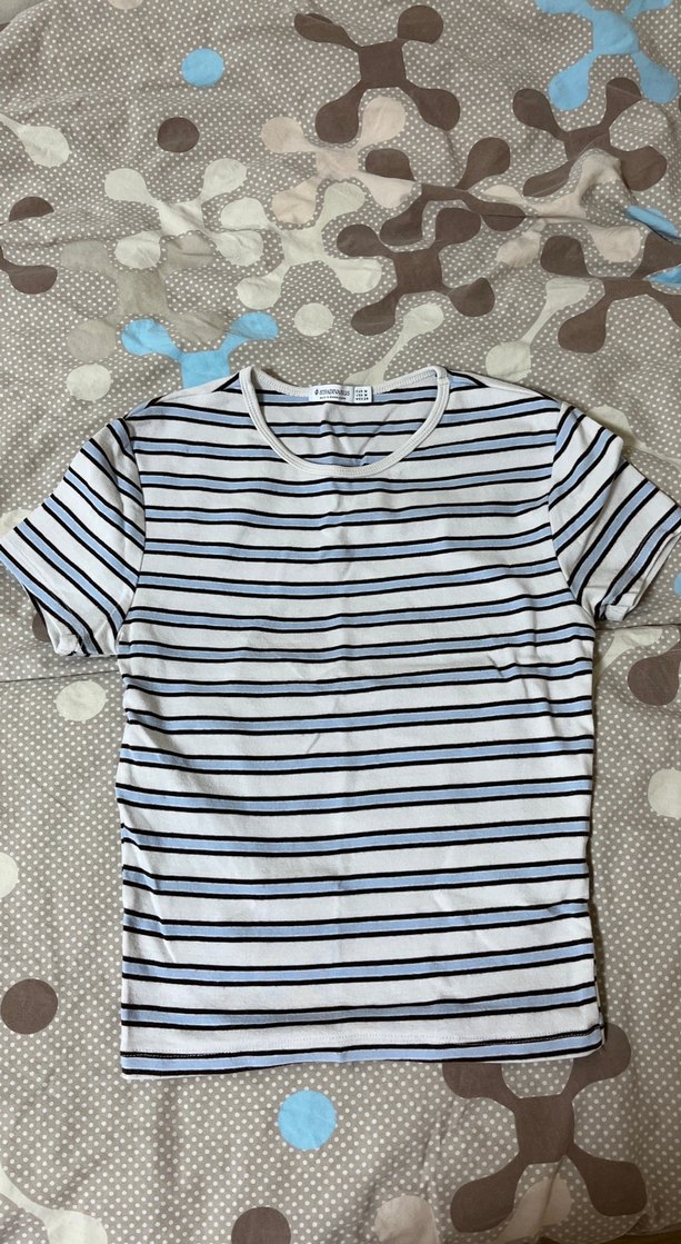 Beyaz ve gri çizgili, pamuklu kumaştan yapılmış, kısa kollu ve bisiklet yaka, vücuda oturan kadın tişörtü. Günlük kullanıma uygun, rahat ve şık bir tasarım.