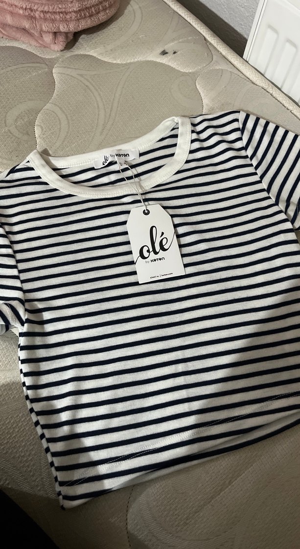 Yumuşak pamuk kumaştan, dar kesim, beyaz zemin üzerine koyu renk çizgili, kısa kollu ve tekne yaka kadın tişörtü. Günlük kullanıma uygun, rahat ve şık bir Paris tarzı. Etiketinde 'olé' yazıyor.