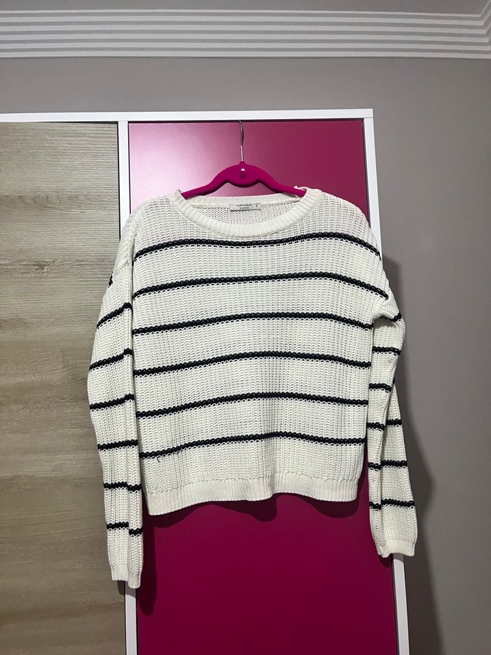 Kadınlar için gevşek kesim, uzun kollu ve yuvarlak yakalı örgü kazak. Çizgili deseniyle günlük kullanıma uygundur.